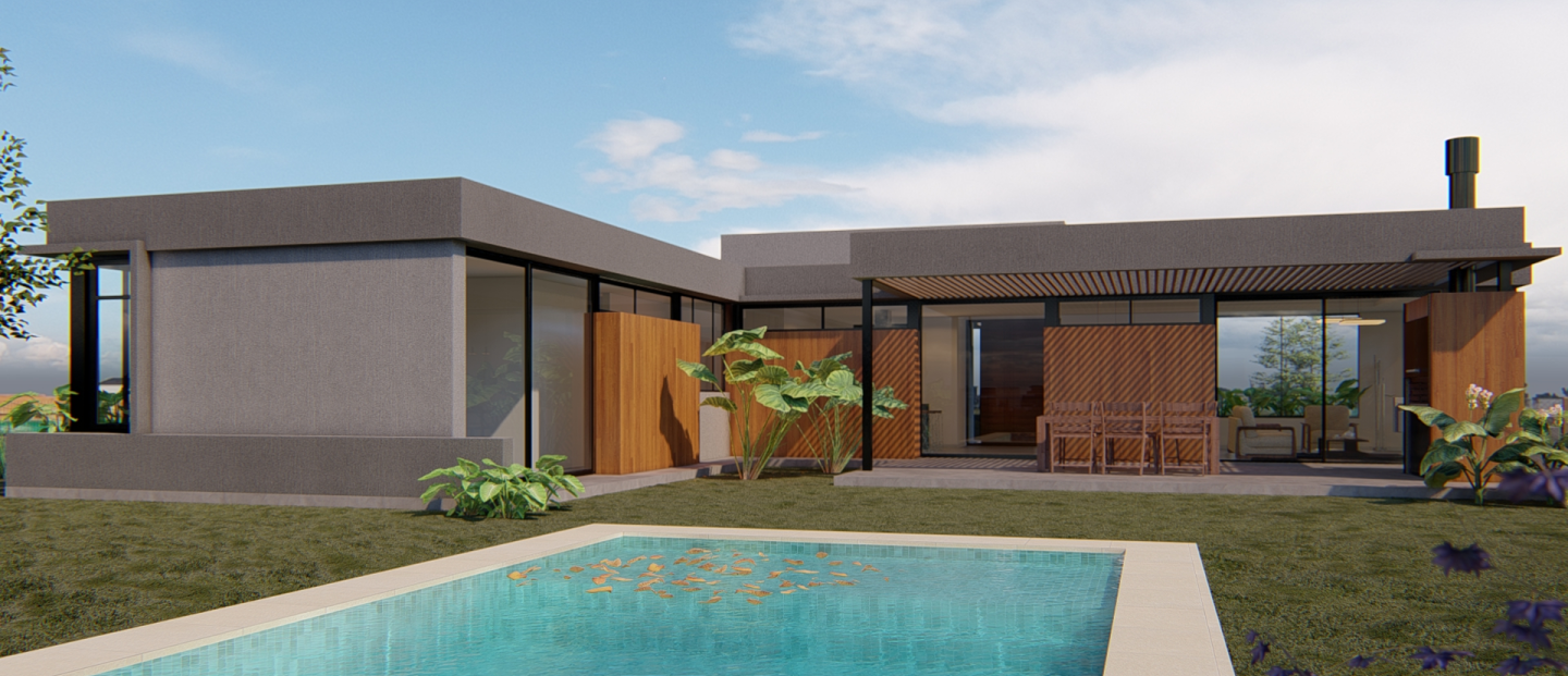 El acceso está pensado para que al ingresar se contemple la profundidad del terreno que remata en la pileta. En cuanto a su distribución en planta se distinguen dos sectores, uno de carácter público donde se encuentra el living y otro más privado donde se desarrollan las habitaciones.