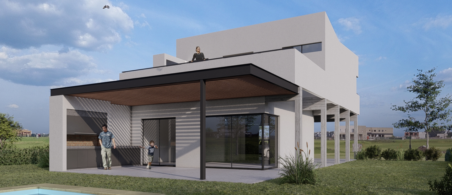 Se aprovecho el ancho del terreno para darle a las tres habitaciones el mismo asoleamiento y permitir recostar los servicios y la escalera en el centro de la casa conectando sus dos niveles. Sus locales tanto en planta baja como en planta alta expanden a semicubiertos que permiten una mayor integración con el exterior.