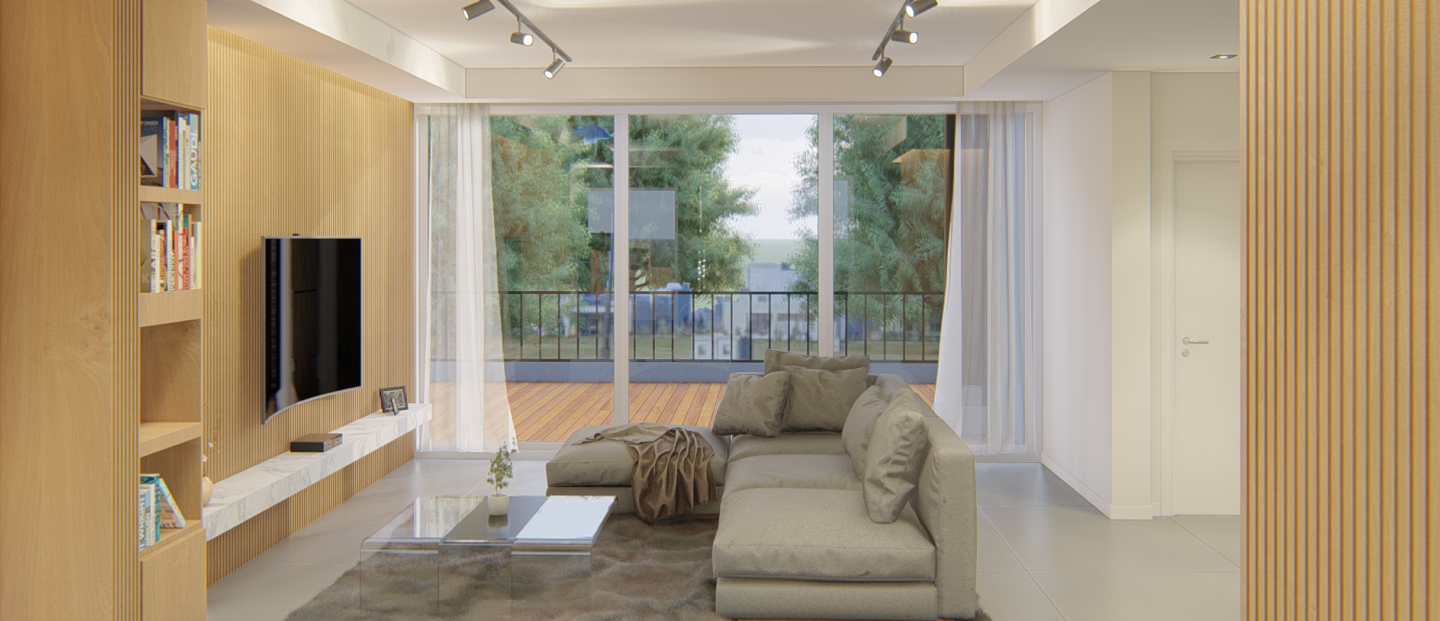 Se generaron 3 habitaciones nuevas con un baño personal para cada una. En el medio se desarrolla un living distribuidor de todos los espacios privados y que expande a una terraza que se genera a partir de cubrir un techo liviano anterior con un deck de madera.